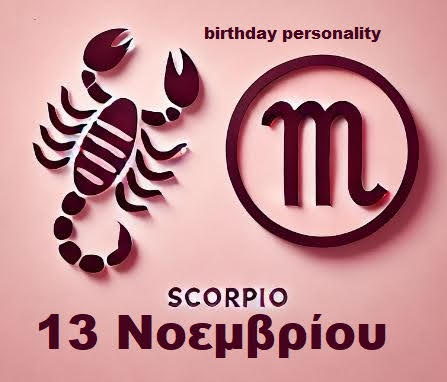 Το ωροσκόπιο γενεθλίων της 13ης Νοεμβρίου θα σας δώσει κάποιες γνώσεις για την προσωπικότητα του ατόμου. Αυτή η ημερομηνία είναι μια φυσική κοινωνική ημέρα. Είναι επίσης πολύ παρατηρητικοί. Έχουν συναισθηματική νοημοσύνη πάνω από το μέσο όρο και συχνά είναι άριστοι επικοινωνιακοί. Μπορούν να είναι εξαιρετικοί στην ανάλυση του εσωτερικού κόσμου των άλλων και οι έντονες προσωπικότητες τους μπορούν να τραβήξουν την προσοχή. Είναι επίσης εξαιρετικά παθιασμένοι και πιστοί και μπορούν να χρησιμοποιήσουν αυτό το χαρακτηριστικό προς όφελός τους σε όλες τις πτυχές της ζωής τους.