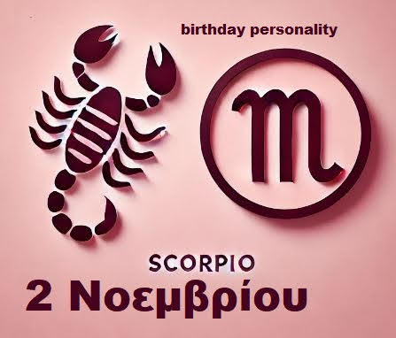 Οι γεννημένοι στις 2 Νοεμβρίου έχουν πολλά ταλέντα και χαρίσματα. Αν και μπορεί να δυσκολεύονται να επιλέξουν μια καριέρα, αυτοί οι άνθρωποι συνδέονται γρήγορα και δίνουν την ενέργειά τους στους άλλους. Το μειονέκτημα αυτού του χαρακτηριστικού είναι ότι αυτοί οι άνθρωποι δεν είναι πολύ επιεικοί και δυσκολεύονται να αφήσουν τους προηγούμενους συναισθηματικούς αγώνες τους. Η έντονη αίσθηση της αυτοεκτίμησής τους σημαίνει ότι θα πρέπει να μάθουν να αντιμετωπίζουν την απόρριψη για να αποφύγουν τα πληγωμένα συναισθήματα.